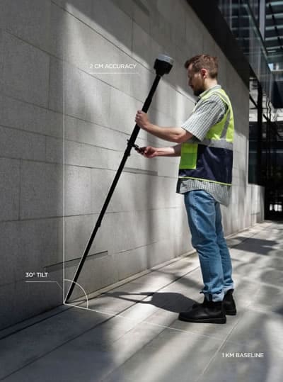 最大60度までポールを傾けた状態でも測位が可能で、「垂直に立てられないから測れない」という場面を大きく減らします。