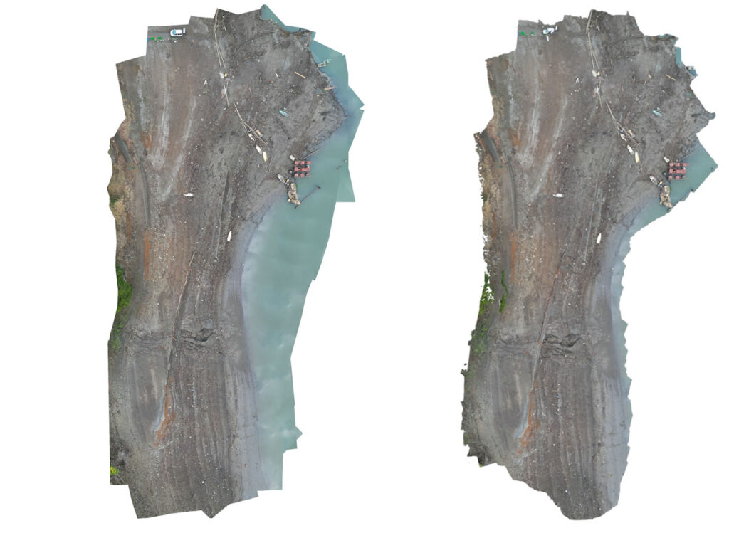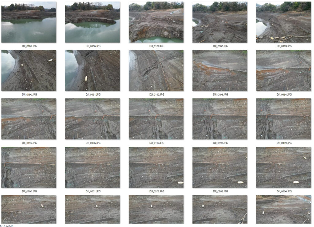 今回、比較用データとして小型ドローン「DJI Mini 3 Pro」で撮影した湖岸のデータで、垂直写真と斜め写真を合わせて98枚を対象としました。