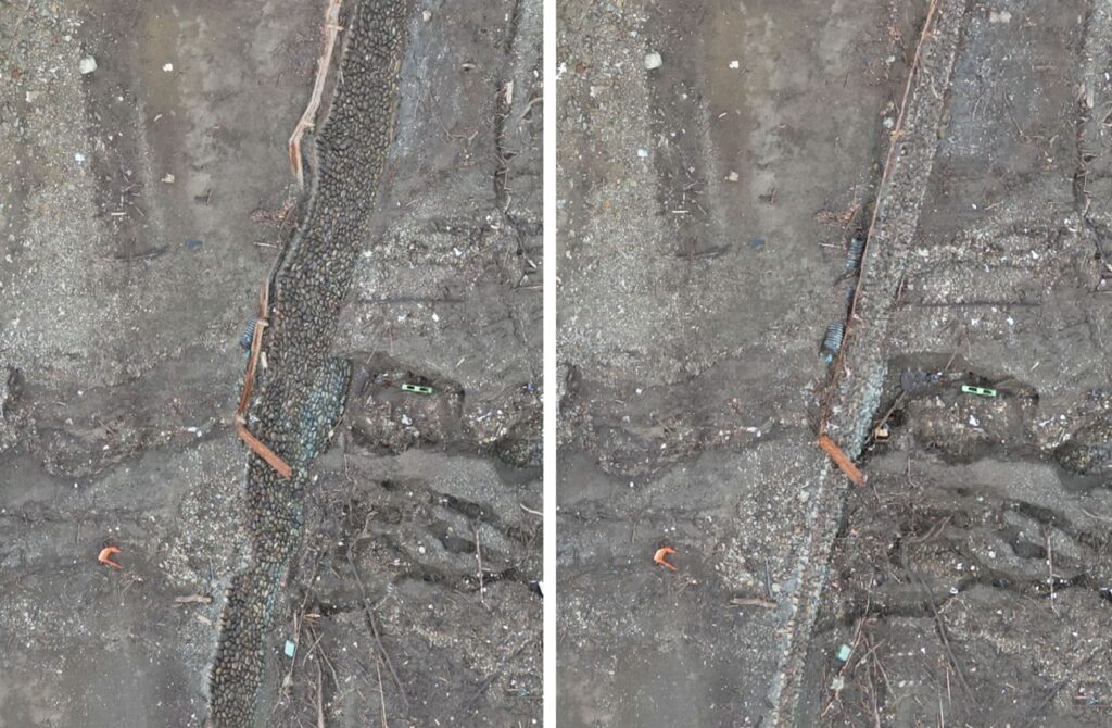 全体像では合成画像作成範囲の外縁が直線的なこと以外はさほど差が感じられません。 しかし、詳細を確認するとその精度には明確な差が確認できます。次は中央やや下の石垣とガードレール付近を拡大したものです。