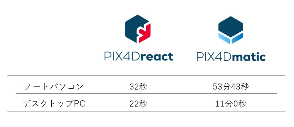 PIX4D reactはフルサイズの航空写真測量ソフトウェアと比較すると非常に短時間でマップ生成(画像生成)が可能です。特にスペック面で見劣りするノートパソコンで差が大きいです。