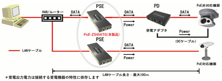 ・PoE非対応カメラおよび周辺機器へのDC電源電圧供給、DC電源出力にスイッチングハブを接続して最大200mのLANケーブルの延長が可能です。