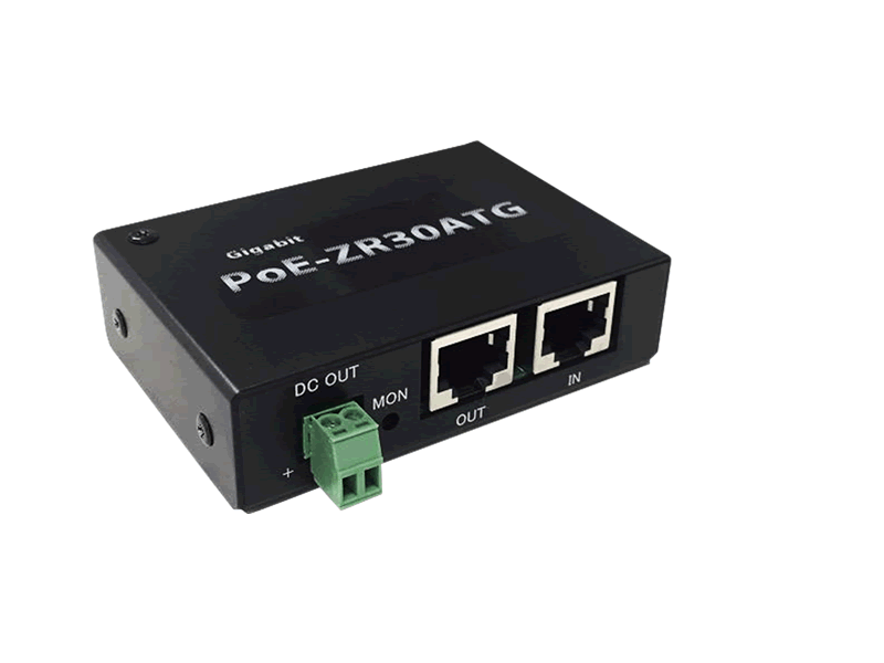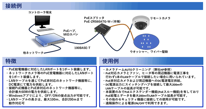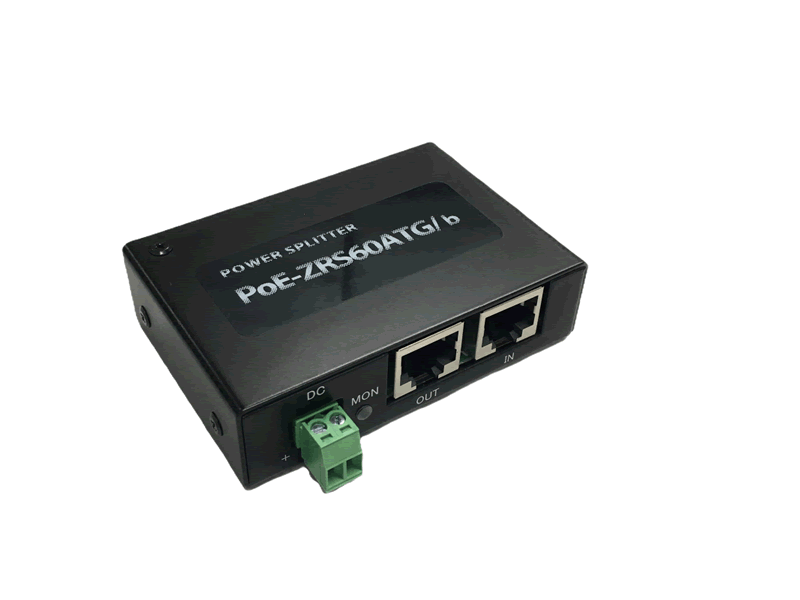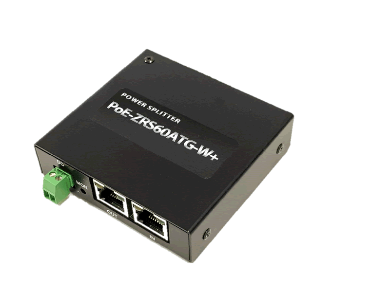 PoE-ZRS60ATG-W+はIEEE802.3af/at規格に準拠したPoE受電機能、給電機能および外部機器への電源供給機能を持った産業用PoEスプリッタです。