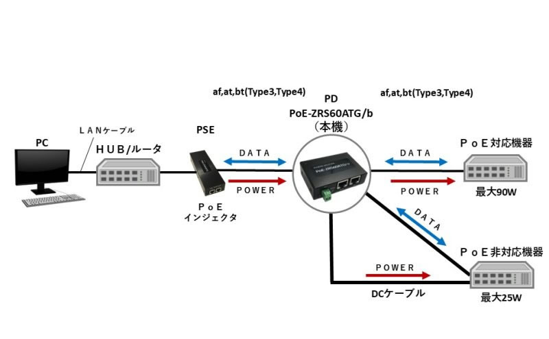 PoE(Power Over Ethernet)技術を用いたIEEE802.3bt規格に準拠した受電および給電機能を各1ポート装備した装置です。