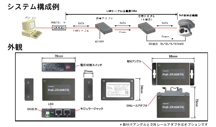 | 適合受電アダプタ | PoE-ZRシリーズ,IEEE802.3af/at規格適合品 |