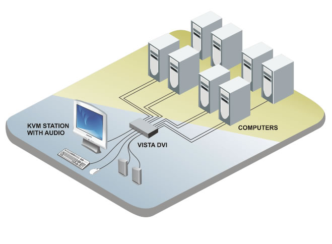 選択されたコンピュータのDVIビデオ及びオーディオは、共通のキーボード・マウス・モニターに押しボタン操作、あるいは、簡単なキーボードのホットキー操作で選択され、出力されます。