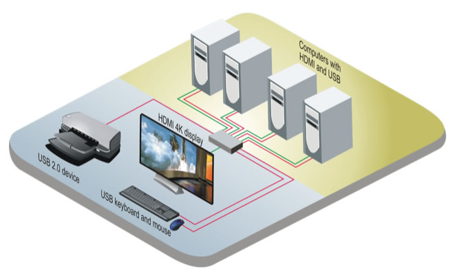 このマルチプラットフォームのKVMスイッチは1台のHDMIの高解像度のモニターをUSBキーボードとマウスでコントロールを通して4台のコンピューターを管理することが可能です。